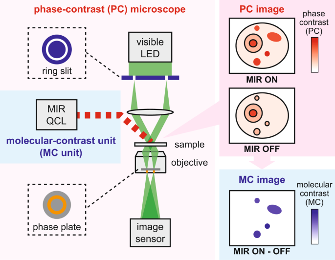 東京大学大学院理学系研究科の井手口拓郎准教授らの研究グループは、市販の位相差顕微鏡に赤外レーザー光を照射するユニットを付与するのみで、通常の顕微画像の上に分子の空間分布画像をのせる新技術の開発に成功しました。汎用的に用いられている顕微鏡にユニットを追加するのみで実装できる簡便な手法であることから、基礎科学への利用のみならず、病気の診断や工業製品・食品の品質検査など、医療や産業での利用も期待されます。