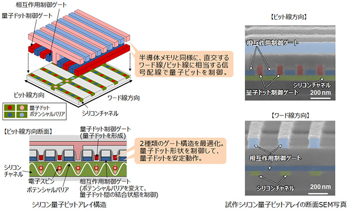2次元シリコン量子ビットアレイ構造(左図)と試作した量子ビットアレイの断面写真(右図)