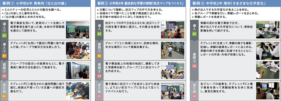 「導入」→「展開」→「まとめ」という一つの授業の流れに注目し、効果的にICTを取り入れている実践事例を整理しました。