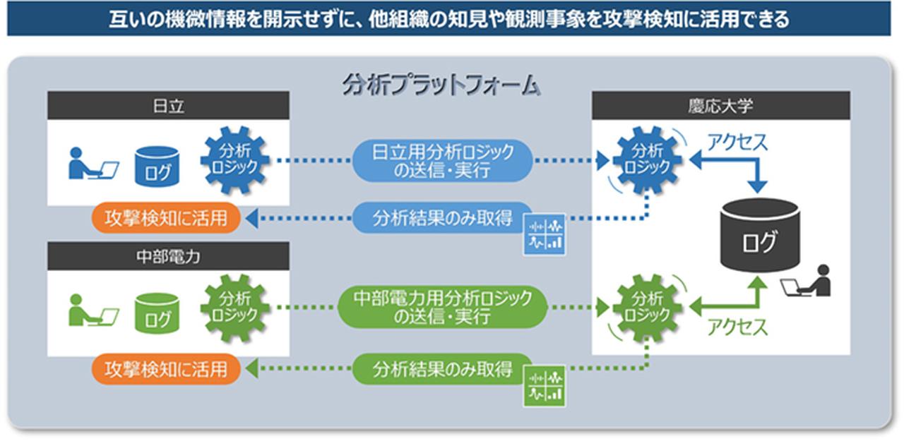 日立は、慶應義塾大学(以下、慶應大学)および中部電力株式会社(以下、中部電力)と共同で、サイバー攻撃の検知精度を高めるため、他組織が持つインターネットとの通信履歴や攻撃対処履歴など(以下、ログ)を機密性を担保しつつ共有する分析プラットフォーム、およびプラットフォーム上で悪性Webサイトを検知する分析ロジックを開発しました。本技術は、各組織のログの内容を互いに開示することなく共有し、情報漏洩の懸念なくそのままサイバー攻撃の分析に活用できることを特長とし、これまでに産学連携で開発してきた「分散型セキュリティオペレーション」の機能を拡張します。