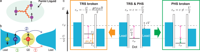 数多くの粒子が量子力学的な相互作用を及ぼし合うことによって形成される量子液体は、粒子一個からは想像もつかないような、多彩な振る舞いを見せます。本研究では、そのような量子液体の一種である局所フェルミ液体の非平衡状態(注3)における振る舞いを明らかにしました。極小の電子回路内に作られた人工原子に、近藤効果(注4)によって量子液体を生成し、その振る舞いが3つの粒子の絡み合い(三体相関)によって決定されていることを実証しました。