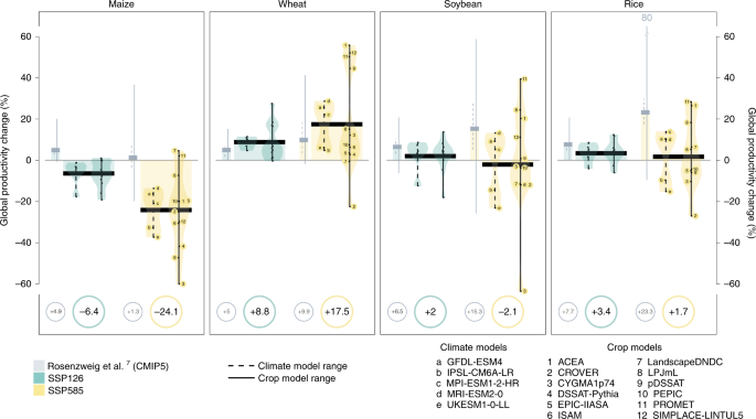 図2 今世紀末までの気候変動による中緯度地域の平均収量への影響