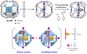 一般に、分子ケージ内にローターを直接設置することは、ケージの窓の大きさに制限があるため、非常に困難である。そのため、研究者たちはボトムアップの戦略に従って、ローターを含むケージを作製してきた。Kim教授らは、こうした難題を回避するために、まず直線状の軸をZn-PB内部に挿入し、次にサイドアームで改造してローターを構築するという新たな戦略を考案した。