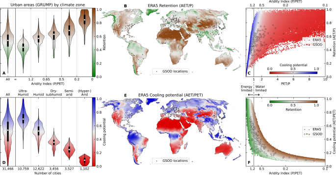 Spatial distributions and interrelationships of ERA5 re-analysis data forced models using intensive substrate (h = 150 mm) for: (B, C) Retention and (E, F) Cooling potential. (A, D) Violin plots for data extracted from GRUMP18 urban areas only. GSOD19 city point-data and locations are shown for reference in (B, C) and (E, F). Equivalent results for other substrates are given in Supplementary Figs. 6 and 7.