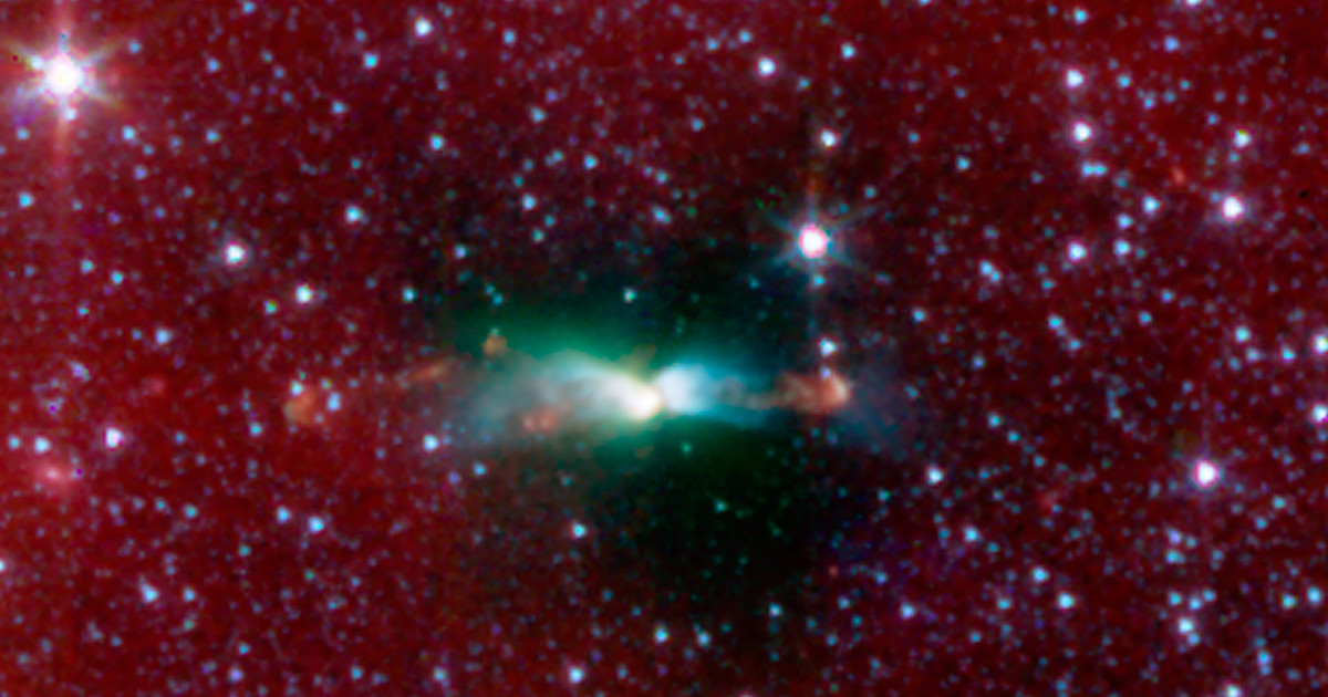A young protostar in L483 and its signature outflow peeks out through a shroud of dust in this infrared image from NASA’s Spitzer Space Telescope. Stars are known to form from collapsing clumps of gas and dust, or envelopes, seen here around a forming star system as a dark blob, or shadow, against a dusty background. The greenish color shows jets coming away from the young star within. The envelope is roughly 100 times the size of our solar system. CREDIT: NASA/JPL-Caltech/J.Tobin (University of Michigan)