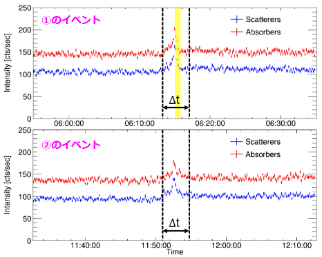 図4 コンプトンカメラでとらえた①、②のイベントのガンマ線の強度変化。どちらも継続時間4分程度のバースト状の増大が検出されている。