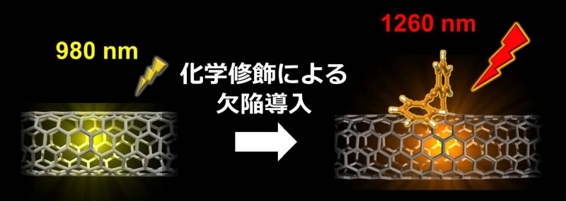 炭素原⼦のみで構成されるカーボンナノチューブは、近⾚外領域の発光を⽰す特性を有し、バイオイメージングや通信技術など先端光技術への応⽤が期待されています。⼀⽅で、⼀般にカーボンナノチューブの発光効率は低く(1%未満)、発光波⻑もチューブの構造で決定される制限がありました。最近、カーボンナノチューブに化学修飾を⾏い部分的な⽋陥形成を⾏うことで、発光効率が向上し発光波⻑が変化した新たな⽋陥発光を⽣み出せることがわかってきました。しかし、従来技術では修飾反応の違いによらず類似の発光特性が観測されており、さらなる光機能創出には⽋陥構造を変化させて選択的に異なる発光波⻑を⽣み出すなどの新たな修飾技術を開発することが求められていました。