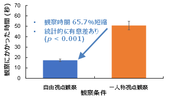 本技術の効果を検証するため、従来技術として、現場の作業者が装着したヘッドマウントディスプレイを通じ、遠隔地の熟練者が現場を観察する方法(以下、一人称視点観察)と本技術の使いやすさを比較しました。具体的には、被験者28名に対し、現場の5段ラックに置かれた4色ブロック数のカウントに要する時間を計測した結果、本技術では従来に比べ観察時間が65.7%短縮しました(図2)。従来技術では、現場の判断で遠隔者と視野画像を共有するため視点が限定され、遠隔からの観察に時間を要する一方、自由視点観察では、遠隔から自由な視点で確認できるため時間を短縮でき、観察エラーも低減すると考えられます。