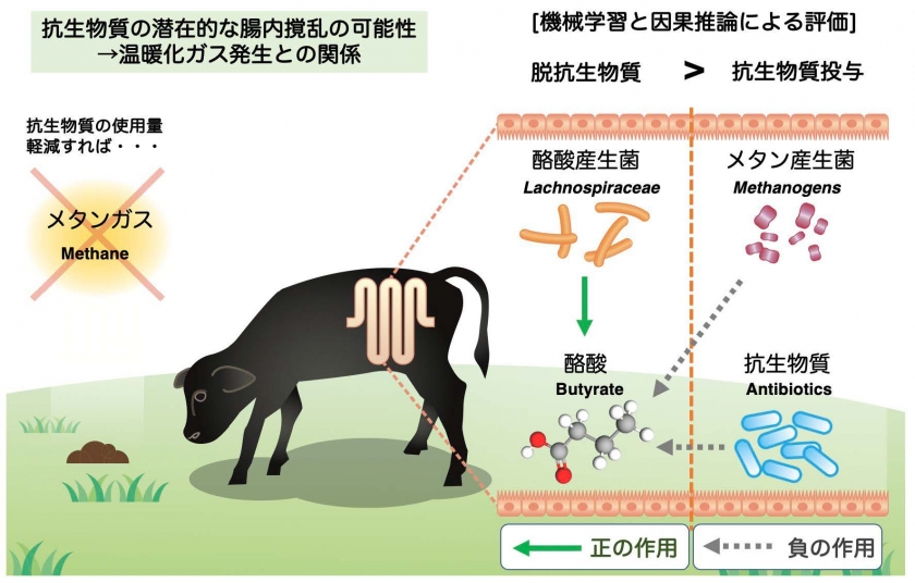 ルーメン未発達の子牛腸内において、腸管免疫系などに影響する酪酸の産生に関与する腸内細菌に対する正の影響が、抗生物質を投与しない時には働き、抗生物質を投与した場合は、この反応に対して負の影響を与え、腸内細菌としては、メタン産生古細菌が負の影響を与えることが機械学習と因果推論の結果、予測することができました。潜在的な腸内撹乱の可能性を、計算科学を活用して予測できたことから、新しい研究手法とも言えます。本研究の成果は、家畜由来の温暖化ガスの発生が問題視されている中で、抗生物質に頼らない飼育管理によって、温暖化負荷軽減に役立ち、環境保全型の畜産に有用である可能性を示唆しています。