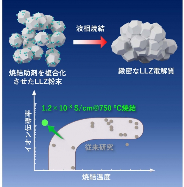 九州大学大学院総合理工学府博士課程3年(兼 株式会社デンソー)の林真大、総合理工学研究院の渡邉賢准教授、島ノ江憲剛教授、国立研究開発法人物質・材料研究機構 (NIMS)の高田和典博士、大西剛博士らの研究グループは電解質の1種であるLi₇La₃Zr₂O₁₂(LLZ)において、汎用的なセラミックプロセスにおける焼結温度を750℃に低温化することに成功しました。従来の低温化技術では背反としてイオン伝導率の低下がありましたが、今回開発した材料では,750°Cでの焼結にもかかわらず、室温でのイオン伝導率が1.2×10-3 S/cmと既存の酸化物系固体電解質のなかでもトップレベルのイオン伝導率を実現しました。今回開発した材料は、LLZと焼結助剤をナノレベルで複合化したものです。この複合化においては、助剤とLLZの濡れ性・助剤へのLLZの溶解度に着目し、LLZへの添加元素や助剤を構成する元素を最適化しました。複合化する助剤量によって焼結性や、イオン輸送経路のボトルネックサイズを調整可能であることを突き止めました。さらに開発した材料を用いて全固体電池を作製し、室温環境において80サイクルにわたって充放電可能であることを実証しました。これまでに報告されたLLZを用いた電池の多くは内部抵抗が高く,60ºC以上でないと動作しませんでしたが、本研究における全固体電池は室温での動作も可能であり,実用化に大きく近づいたものということができます。