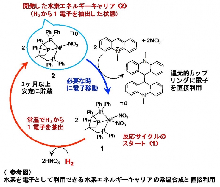 当該研究の内容:(1)常温で水素から「1電子」を抽出・貯蔵できる新しい発想の水素エネルギーキャリアとなるニッケル化合物を開発した。(2)必要な時に水素エネルギーキャリアの電子をそのまま還元反応に利用できる。(3)開発した水素エネルギーキャリアは電子還元剤としてだけではなく、触媒としても機能する。