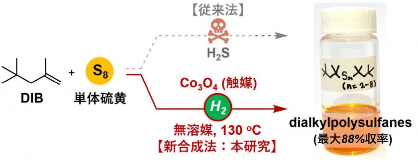 ジアルキルポリスルファン類は、二つ以上の硫黄原子が連結した化合物で、切削加工において装置の摩耗を防止する目的で使用される潤滑油の極圧添加剤として広く利用されている重要な化合物です。工作機械による金属加工などで年間数万トンの需要があります。現在、この化合物はアルケン、単体硫黄に加え、還元剤として硫化水素を原料とする触媒的合成法で製造されていますが、この硫化水素は極めて高い毒性をもつため、入手経路が限られる上、高い管理コストが必要となるなどの問題がありました。