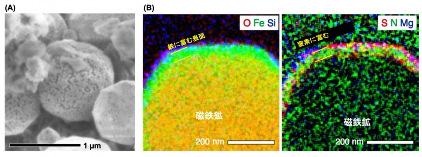 図 (A) 小惑星リュウグウの試料に含まれる磁鉄鉱粒子。天体の中を存在した水の中で成長したため、丸い形をしている。磁鉄鉱の表面はとても多孔質であり、この特徴は宇宙空間にさらされた表面にだけ見られる。 (B) 丸い磁鉄鉱の断面画像。元素の分布を色付けしている。表面に鉄と窒素に富む層が見られる(緑色の場所)。窒化鉄はごく表面の数十ナノメートルの厚みを覆っている。