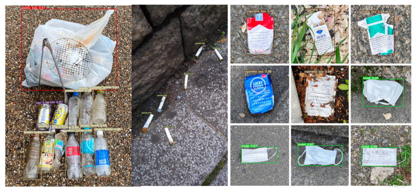 図 1画像中の街ごみの検出例。ごみ拾いSNS「ピリカ」によって位置情報が得られているので、どこにどのような街ごみが、どの程度あるかを地図上にプロットすることが可能(Kako et al., 2024, Fig.4を引用)。